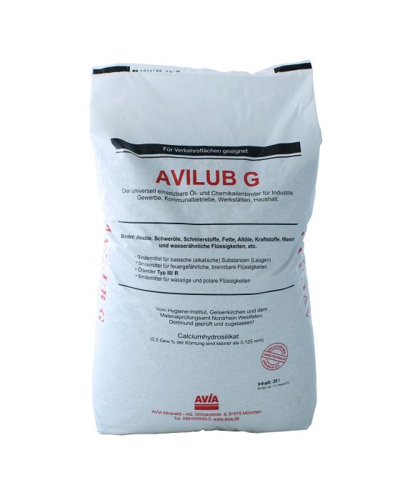 Saugstarkes Porenbetongranulat auf Basis von Calciumhydrosilikat. AVILUB G wurde gemäß den Anfor-derungen an Öl- und Chemikalienbindemittel geprüft und zugelassen. AVILUB G schafft sichere Arbeits-bedingungen, ist trittfest, ungiftig, nicht brennbar und hinterlässt keine Rückstände.