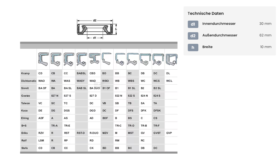 Wellendichtung / Wellendichtring 30x62x10 / Kramp Öldichtung Artikel-Nr. 306210CCP001